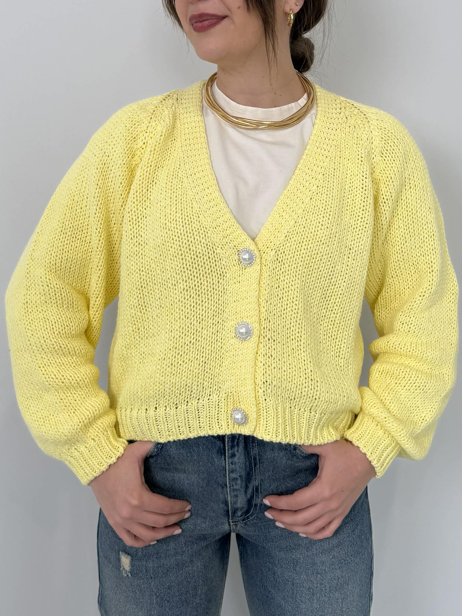 Haveone - Cardigan perla 3 bottoni gioiello giallo