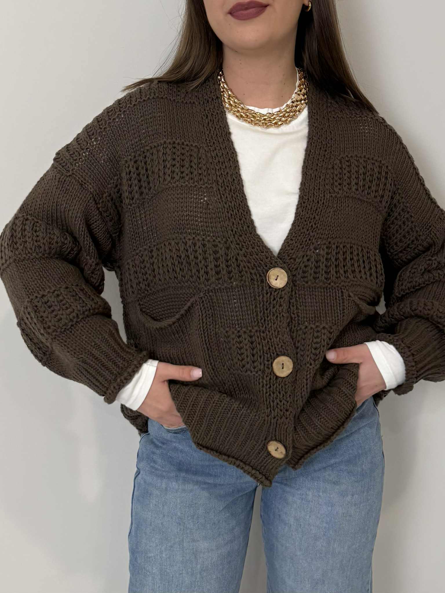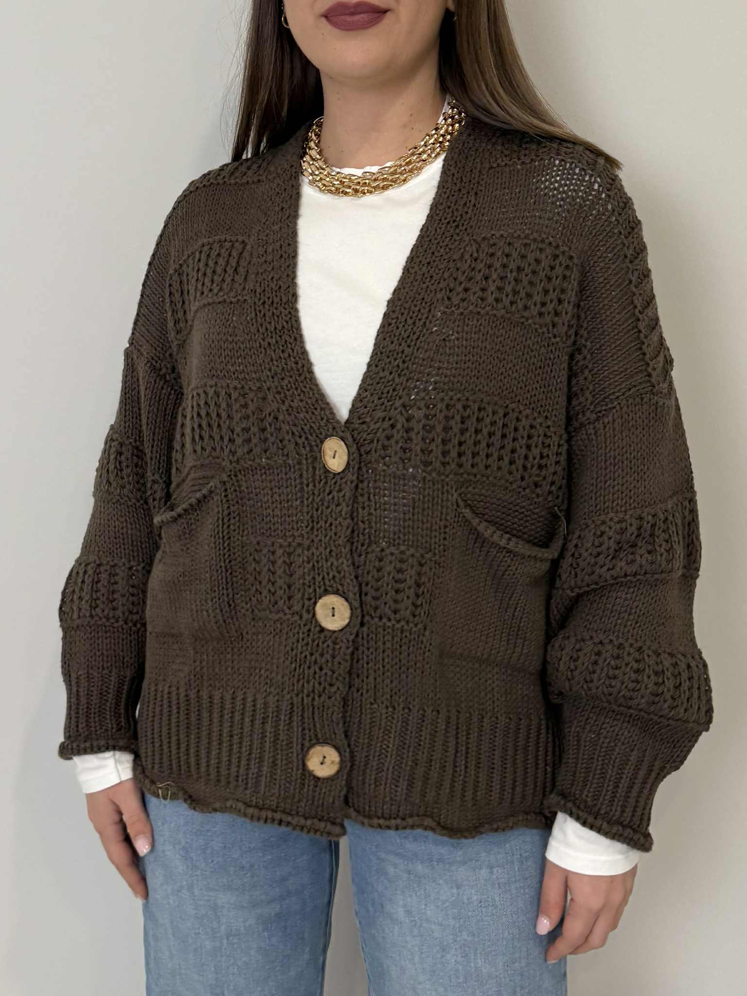 Haveone - Cardigan ricamo bottoni in legno moro