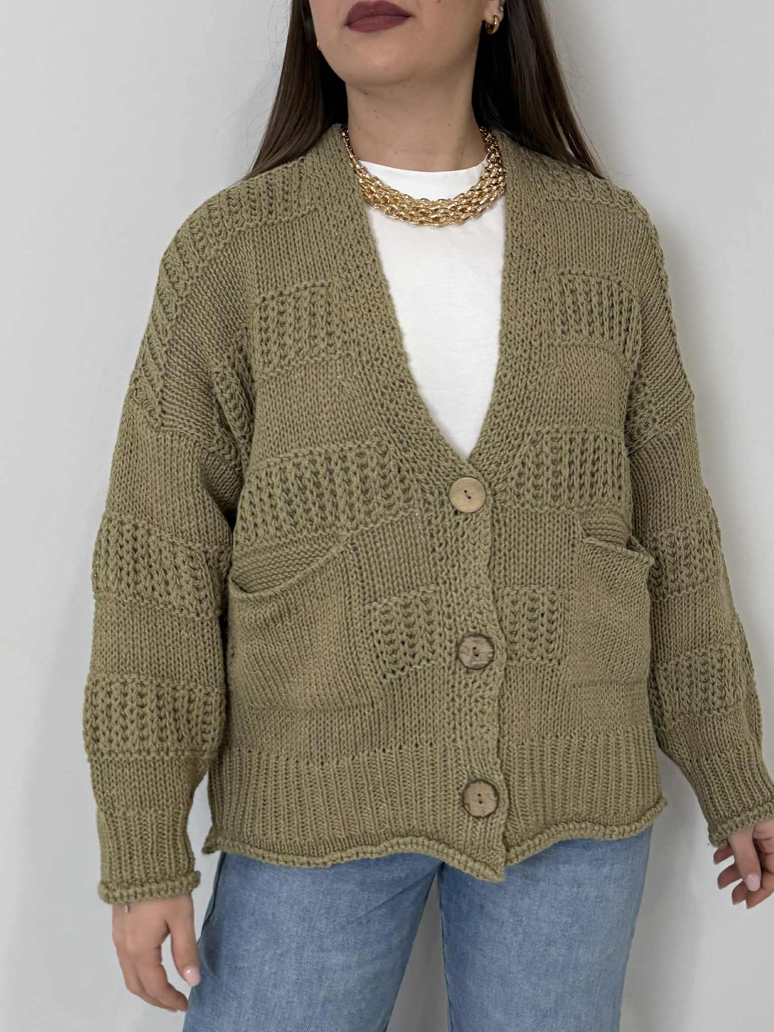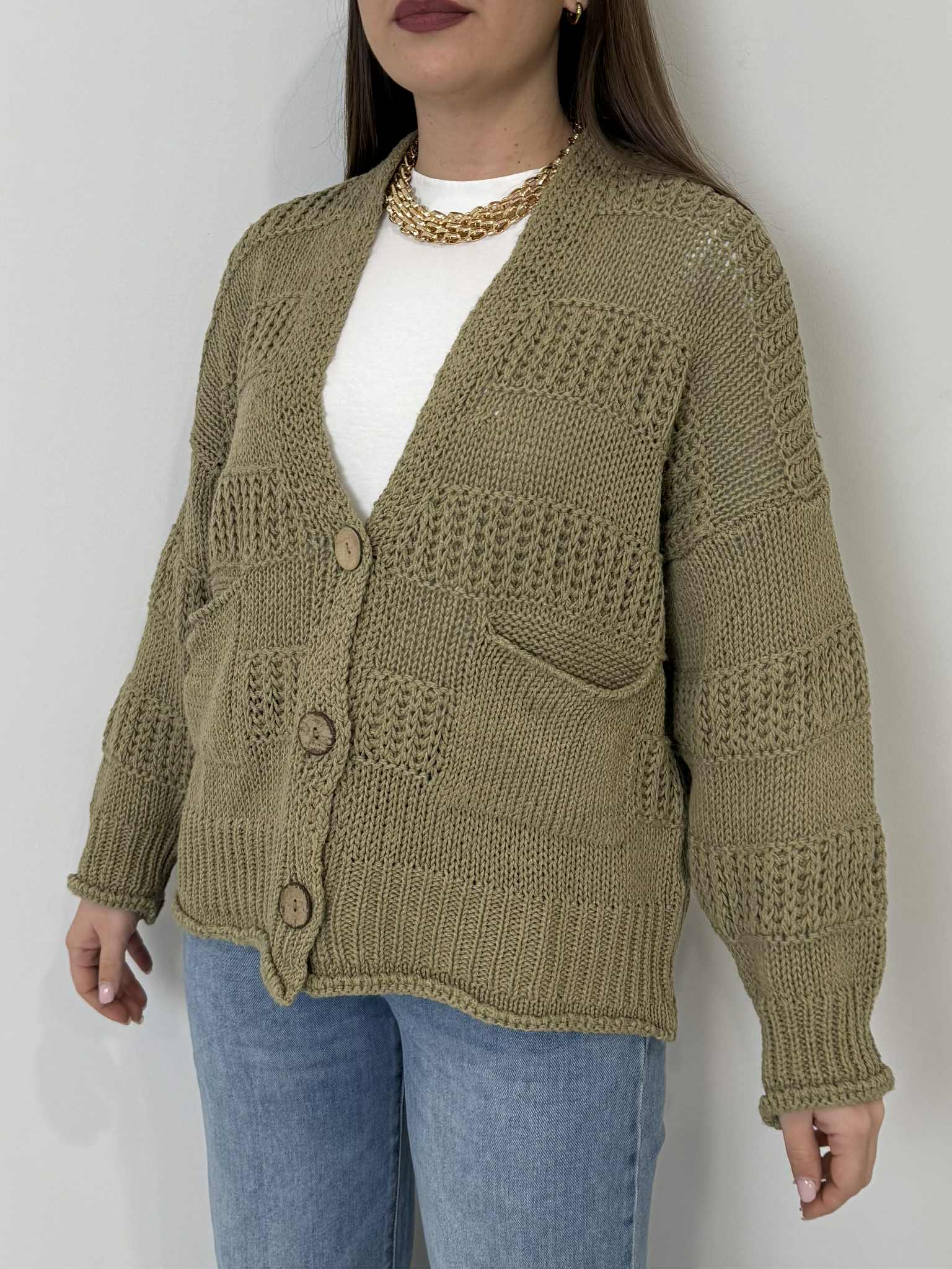Haveone - Cardigan ricamo bottoni in legno salvia