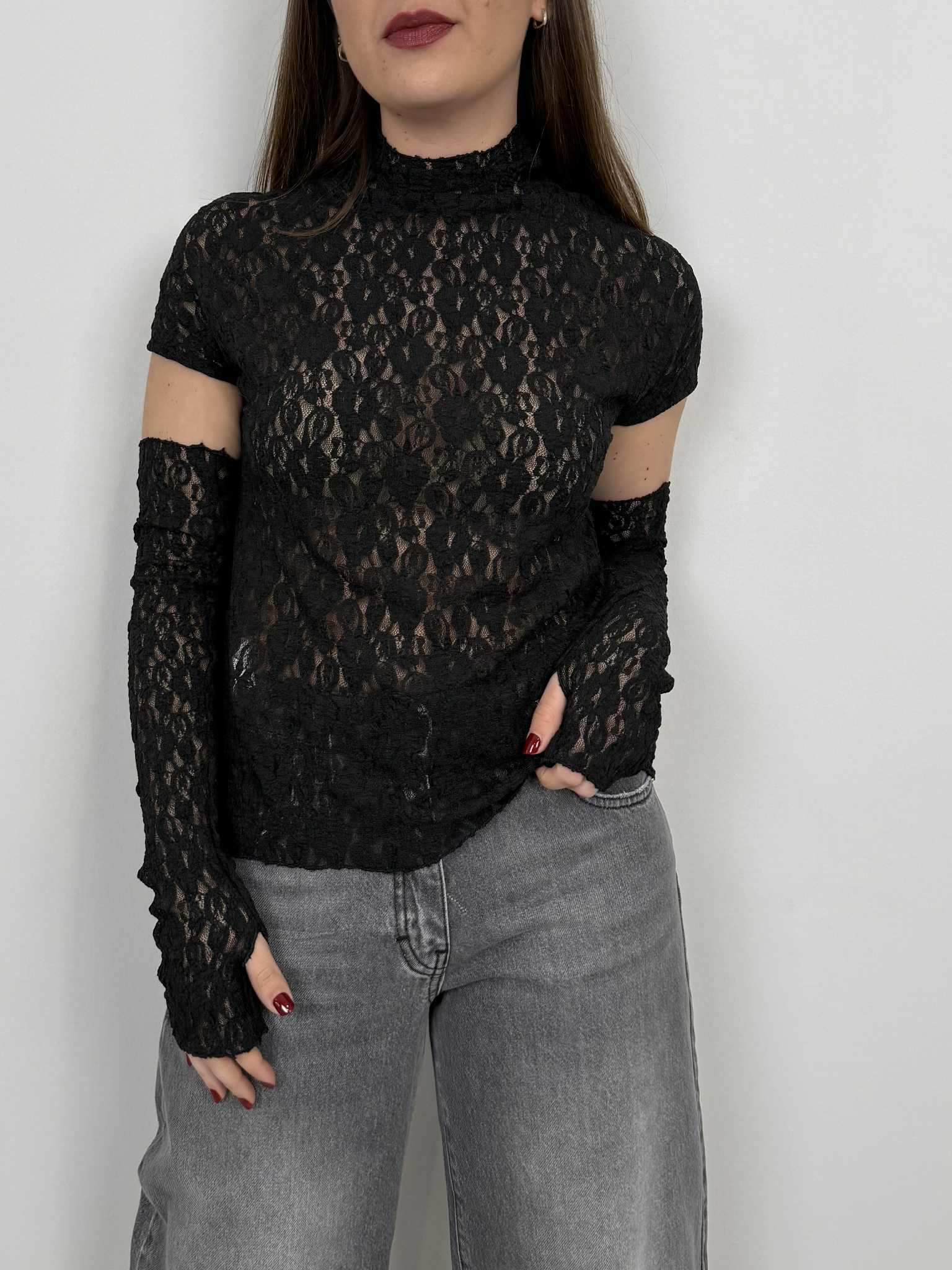 SusyMix - Maglia in pizzo con manicotti moro