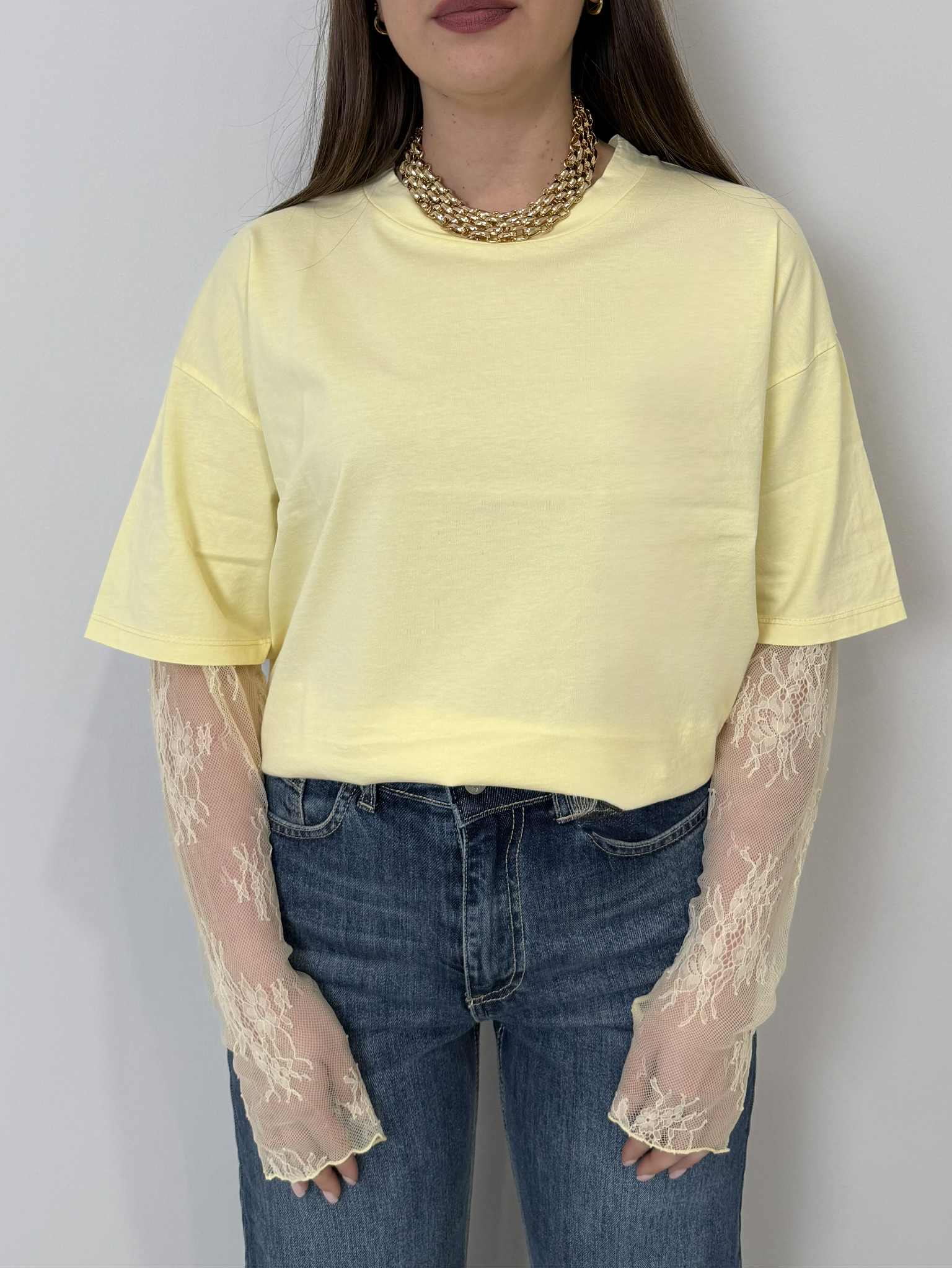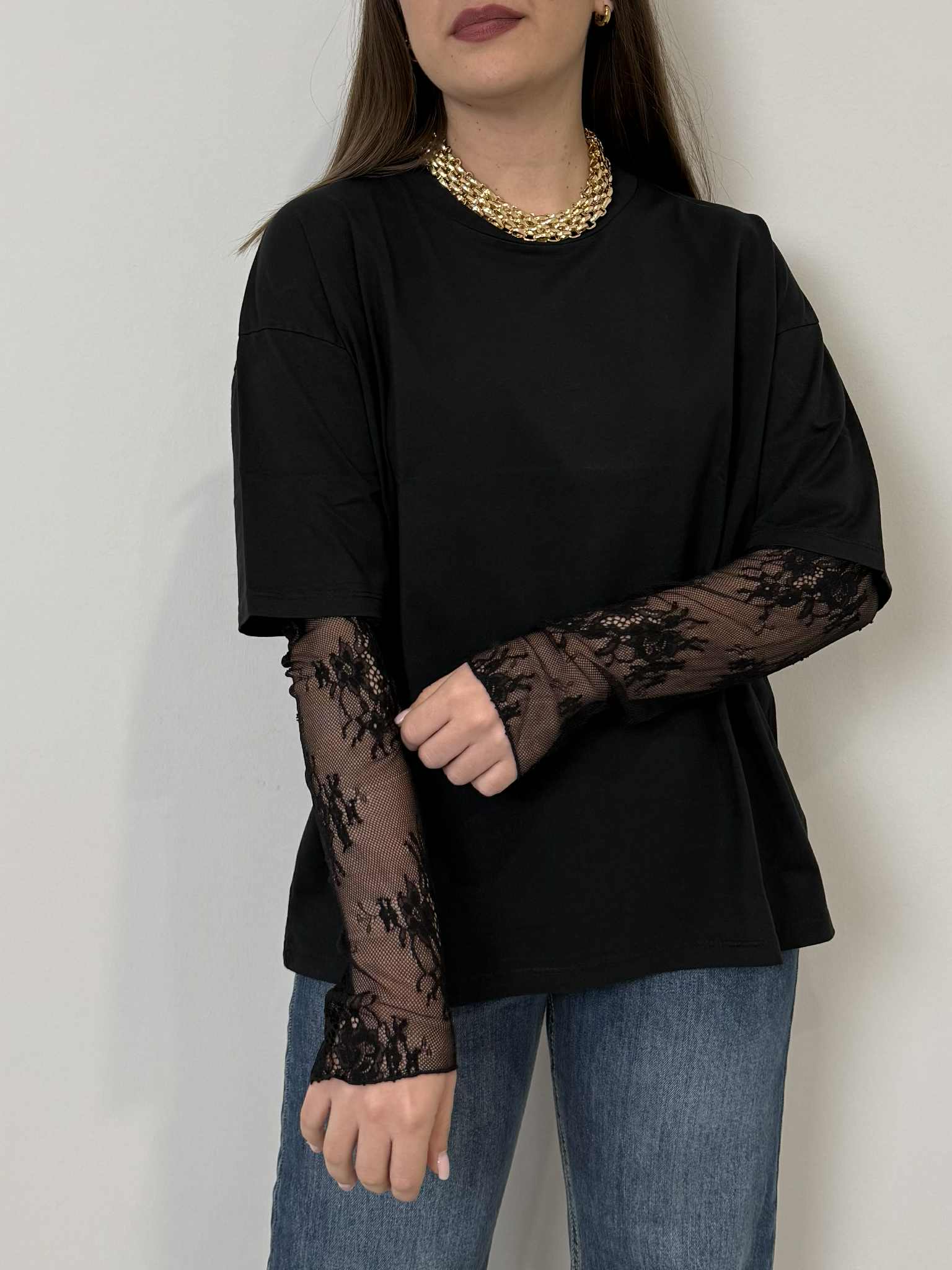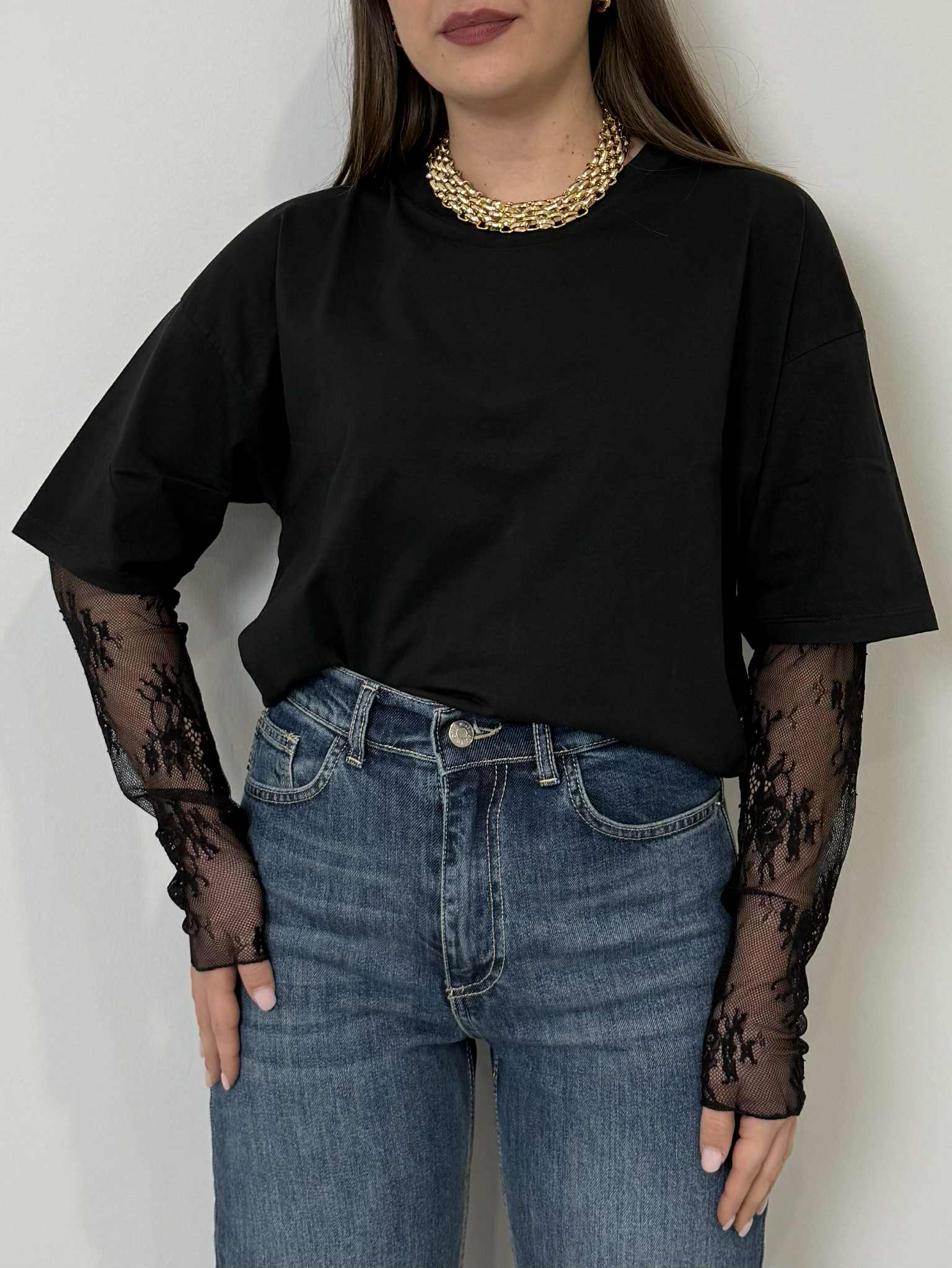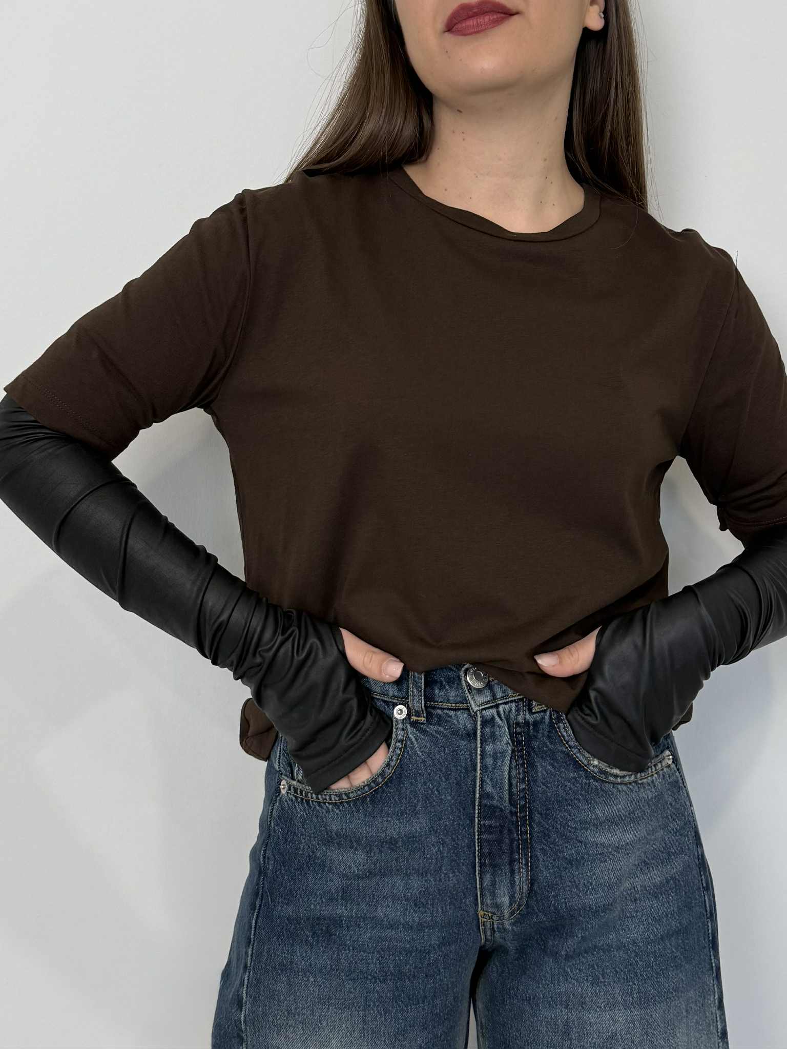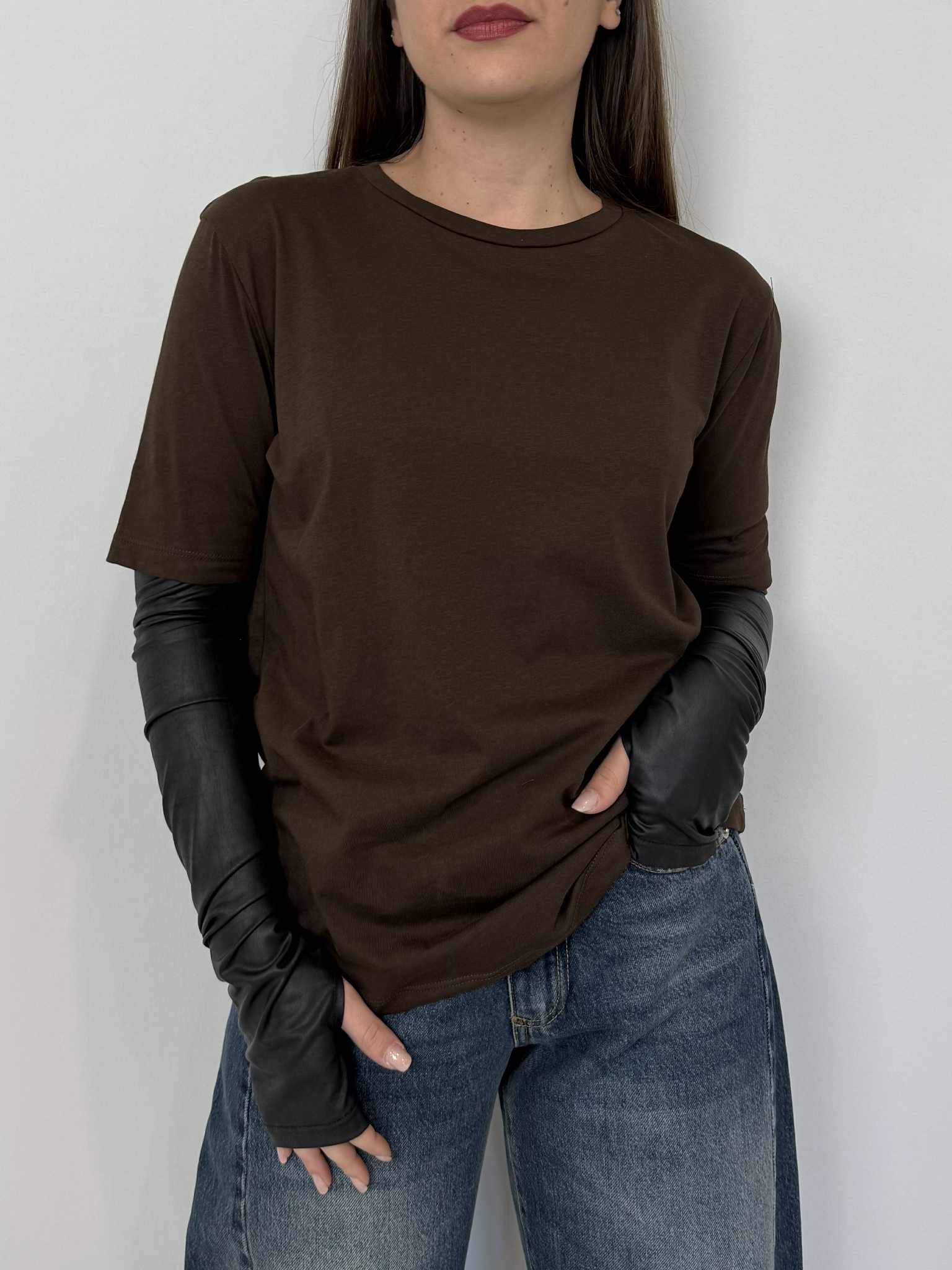 Tensione In - T-shirt moro con manicotti effetto similpelle